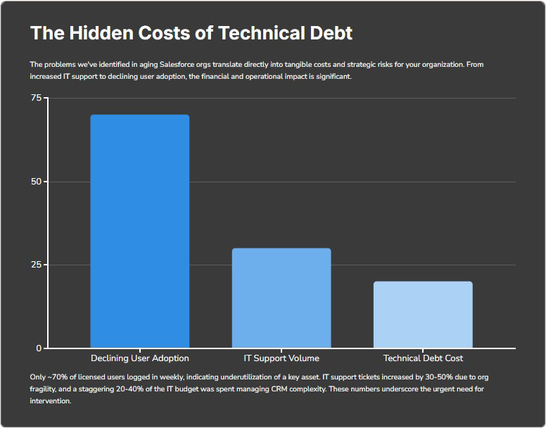 Discover how hidden technical debt can silently degrade your Salesforce performance, impacting user adoption, data quality, and your bottom line.